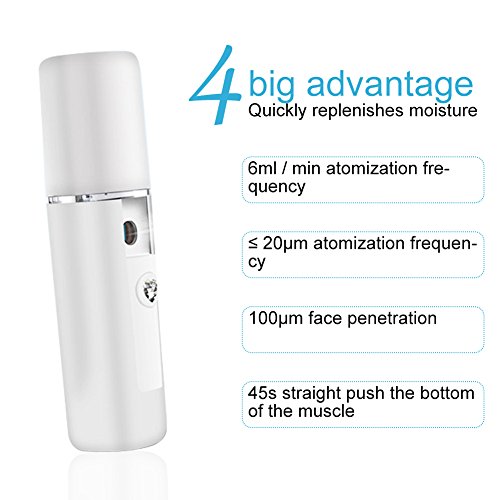 - ?High capacity water tank and elegant appearance?20 ML water tank can be used for more than 15 minutes with large amount of fog. Not only can the atomizer easily be placed in a ladies' make-up bag or lightweight wallet with a leak-proof cap, but it can also be placed upright on the table. The cool refreshing mist is also great for body and hair.