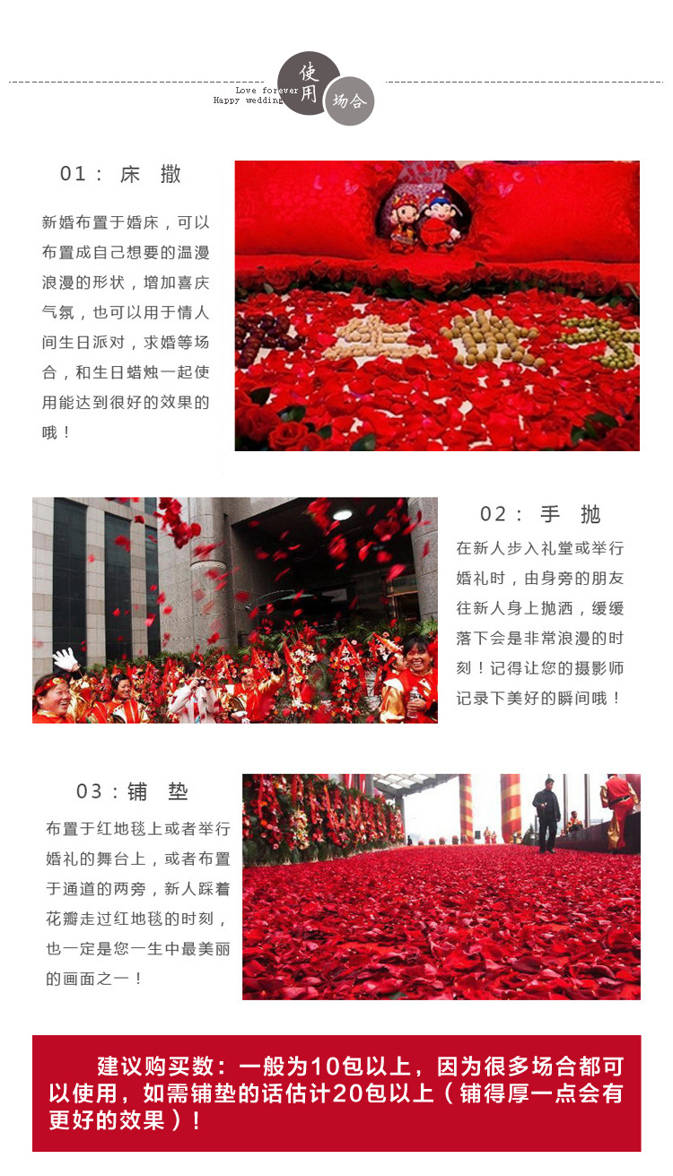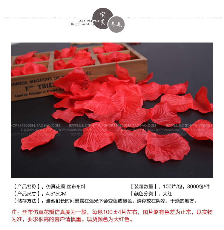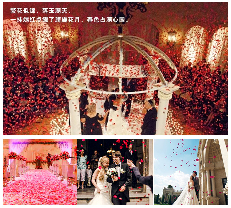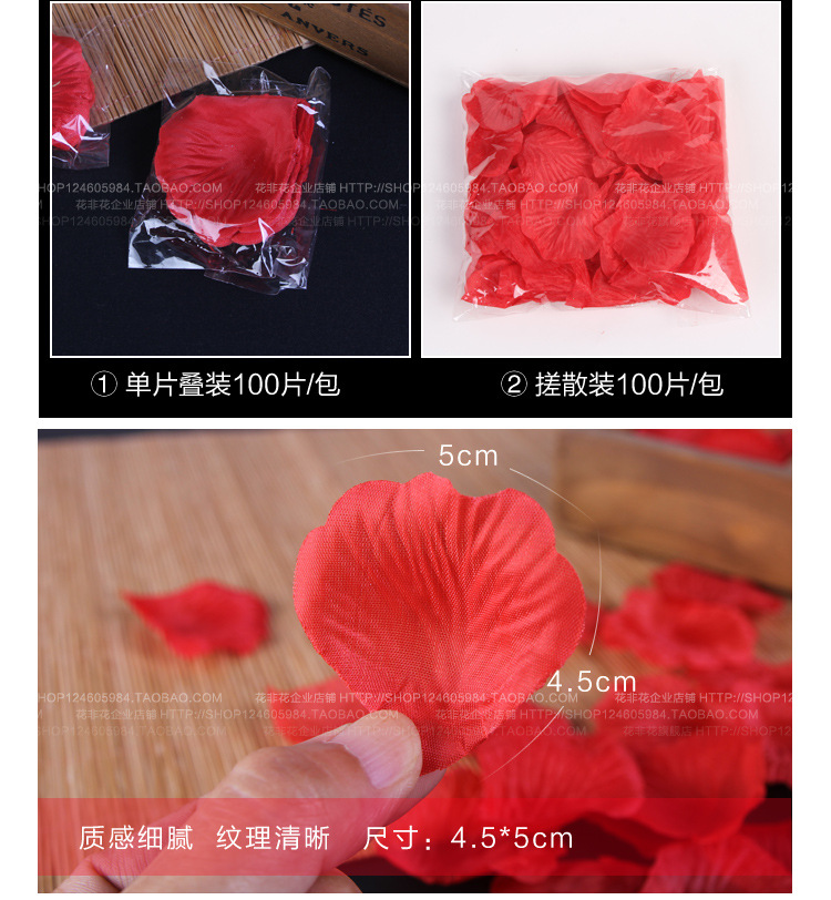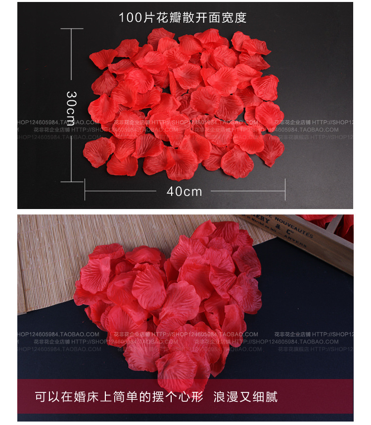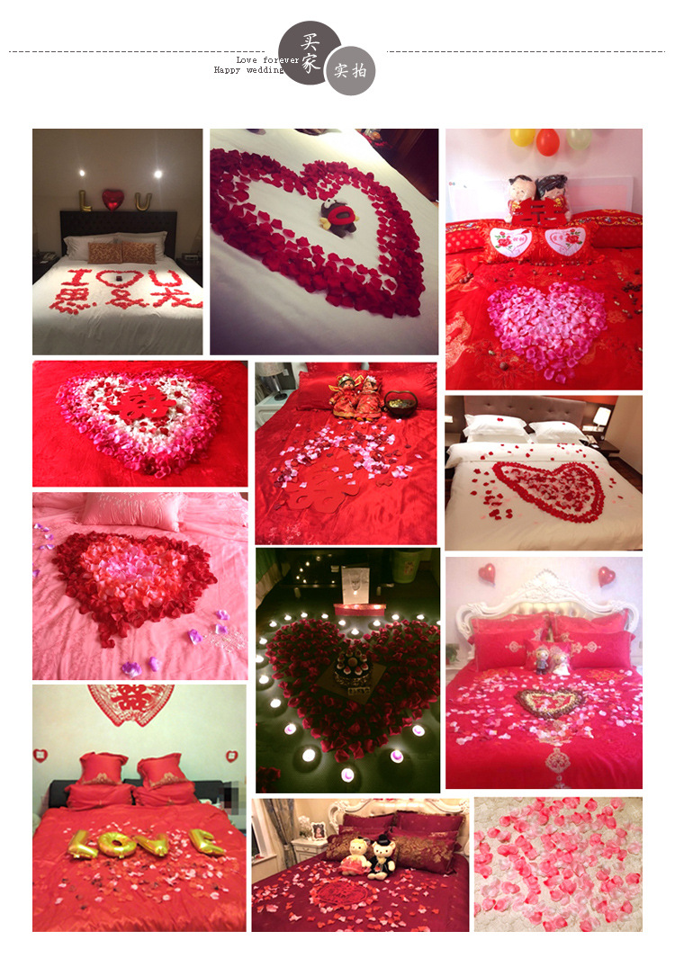 注:仿真玫瑰花瓣采用【丝娟布】制作,虽不及真玫瑰花瓣生动,却很好的解决了真玫瑰花瓣容易弄脏婚床不易清洗的弊端,深受广大新人好评。