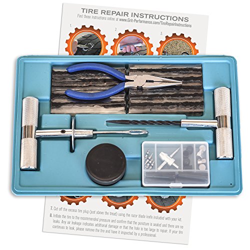 - FULL COLOR INSTRUCTIONS + STORAGE CASE – If you’ve never repaired a flat tire, you are in good hands with Grit Performance. Accompanied by full color, step by step instructions with pictures, even the first time is simple and straight forward. Travel with peace of mind because this tire repair kit is conveniently organized in a compact carry case, so you never have to be stranded with a flat tire.