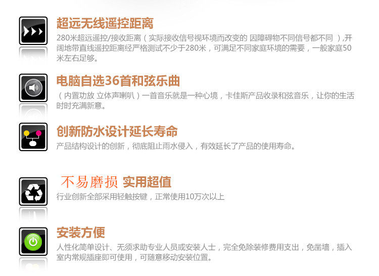 1、交流门铃,接收器(室内机)使用家用电源,直接插插座即可,不费电池,环保方便!发射器(室外机)使用高容量电池一节用一年左右