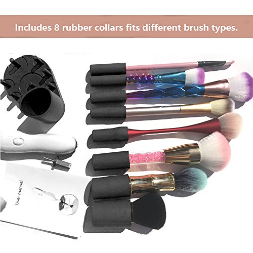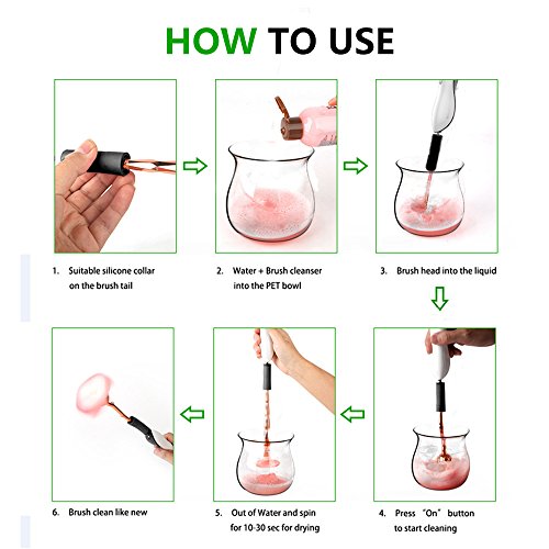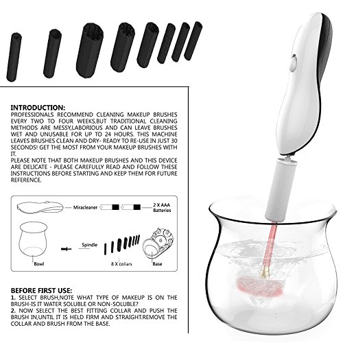 Professional recommend cleaning makeup brushes every 2-4 weeks, but traditional cleaning methodsare messy, laborious and leave brushes wet and unusable for up to 24 hours. this machine leaves brushes clean and dry, ready to re-use in just 30 seconds! get the most from your makeup brushes with it. Easily using steps: 1. Dip and Dunk 2. Spin to Rinse 3. Spin to Dry. Package including: 1/Brush Spinner 1/Attachment spindle 1/Brush Spinner Bowl 1/Silicone seal and splash guard¡®neck¡? 8/Brush Collars(different sizes) 1/Collar stand 1/Instruction leaflet 0