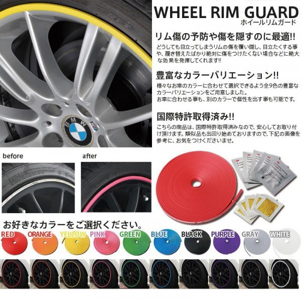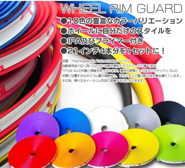 | ホイールのイメージチェンジや傷の防止、傷隠しに、ホイールを外さずに取付が出来るホイールリムガードです。10色という豊富なカラーバリエーションでドレスアップ♪本製品1本で21インチ4本分までカバーすることができます!! |