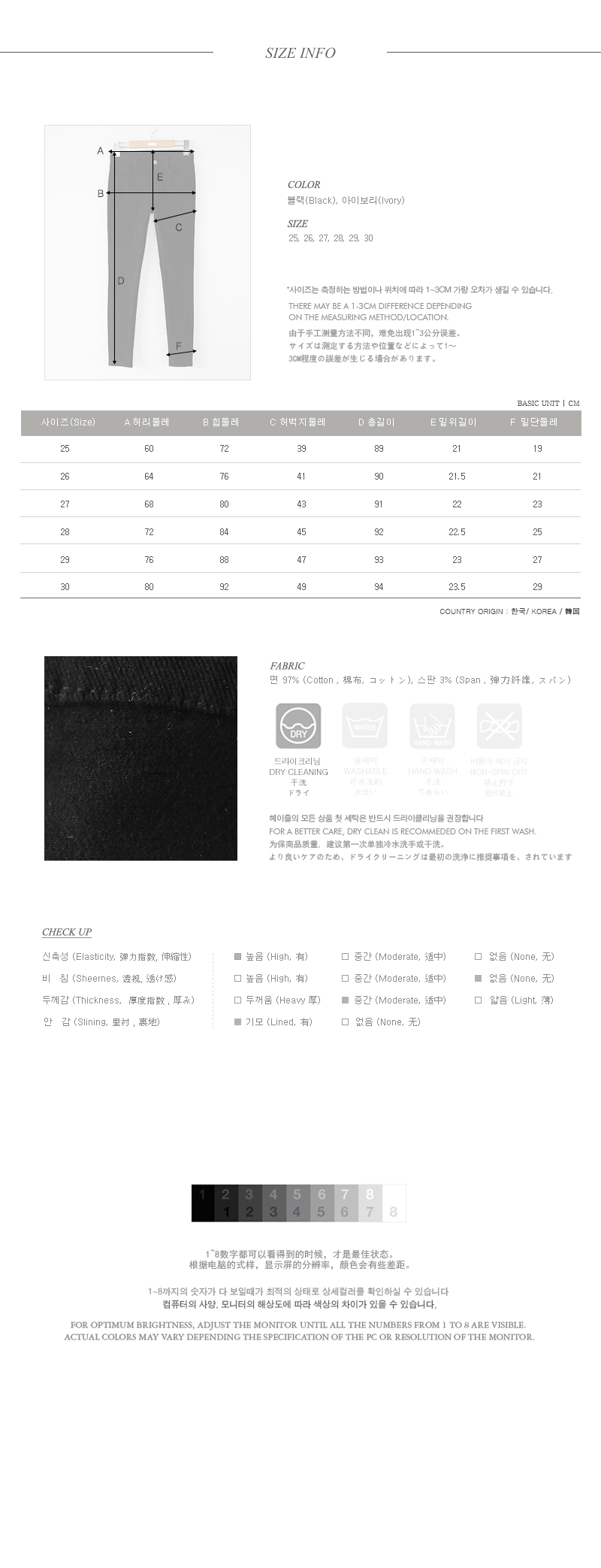 군더더기없는 핏감의 스키니팬츠에요! 적당한 두께감의 기모 안감으로 겨울부터 봄까지 입을 수 있구요 신축성이 좋아 착용감도 편안해요~ 힙라인부터 발목까지 타이트한핏이 날씬한 다리라인을 보여주구요 군더더기없는 심플함으로 다양한 룩에 손색없이 잘 어울려요! 기본 아이템으로 소장가치가 높은 베이직 스키니팬츠랍니다^^*