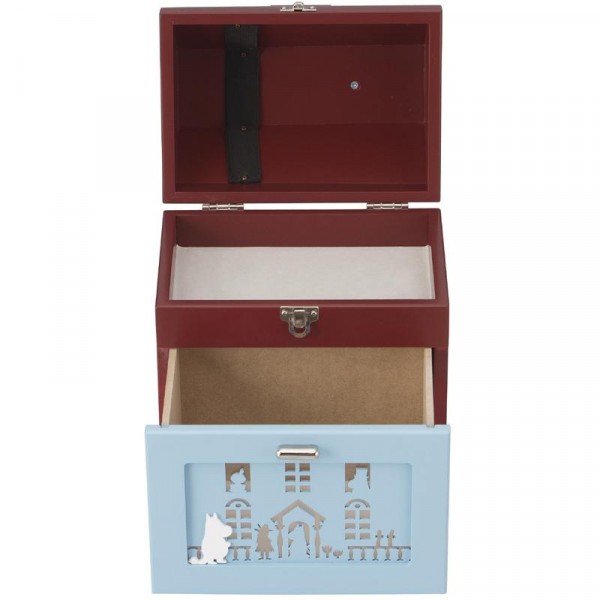 | ムーミンハウスのシルエットが可愛い♪ご家庭の常備薬や小物類を収納できる救急箱です。ふたの裏にはゴムベルトが付いているのでピンセットやハサミなどを収納する事ができます。引き出しはムーミンを始めとした登場人物たちのシルエットが型抜かれています。中に埃などが入らないよう内側から透明のアクリル樹脂を貼っています。 |