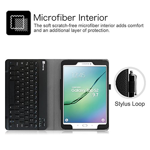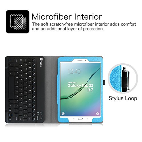 -. Binding : Wireless Phone Accessory -. Brand : Fintie -. Feature : Detachable ultra slim 7mm and light weight bluetooth keyboard with 10M range especially designed for Galaxy Tab S2 9.7-Inch Tablet. Magnet built-in to support sleep/wake function (Auto wake/sleep works with case ONLY). / Real "hard" laptop style keyboard with high end ABS material. Not cheap silicone keyboard as other cases in market. A spring mechanism underneath each key ensures a tactile response with every stroke, helping you to type faster and with less error than on a touchscreen. / Removable Bluetooth keyboard integrates seemlessly with your Galaxy Tab S2 9.7 and other Bluetooth enabled devices. / Slim, durable leather like cover that protects your device. Adjustable stand securely holds your Tab S2 9.7 in landscape mode. / Designed with a smart holder for stylus/pen (stylus NOT included). Available in a variety of bright, fun colors. Package includes one folio case and one removable bluethooth keyboard. -. Label : Fintie -. Manufacturer : Fintie -. PackageQuantity : 1 -. ProductGroup : Wireless -. ProductTypeName : WIRELESS_ACCESSORY -. Publisher : Fintie -. Studio : Fintie -. Title : Fintie Samsung Tab S2 9.7 Keyboard case