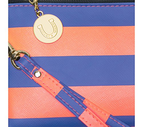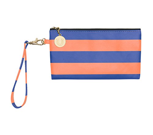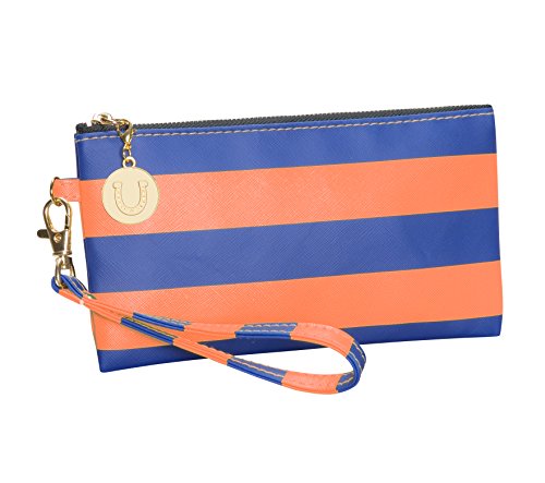 Product Description With this colorful and versatile maroon and orange striped wristlet, you can use as a clutch or remove the wrist strap and use as a makeup bag inside your favorite tote. Cute and clever, these maroon and orange stripes make the statement, while the charm provides the punctuation. 0