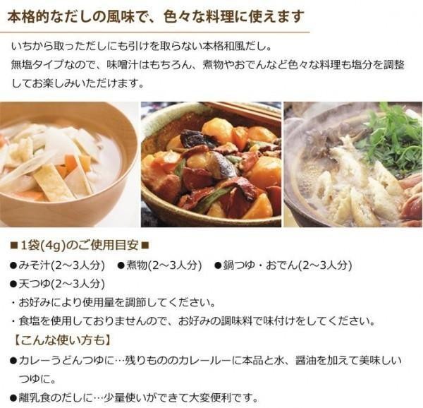 焼津・枕崎地方の鰹節、北海道羅臼産の昆布、国内産椎茸を使用しています。食塩・食品添加物・化学調味料は使用しておりません。塩分93%カット(日本食品標準成分表2010「顆粒風味調味料」ナトリウム値との比較)で食塩を気にされている方や小さなお子様にもおすすめです。 |