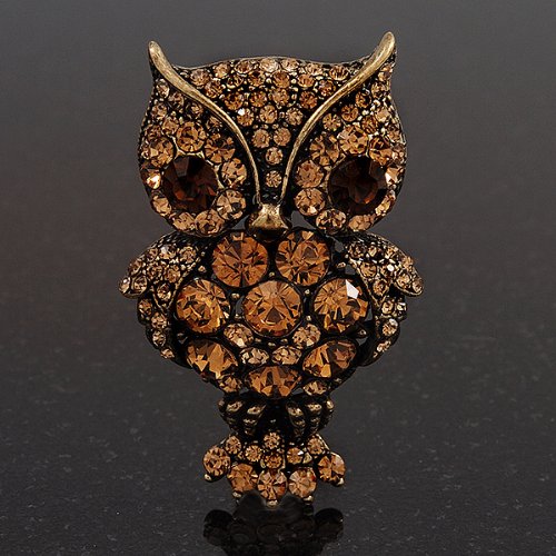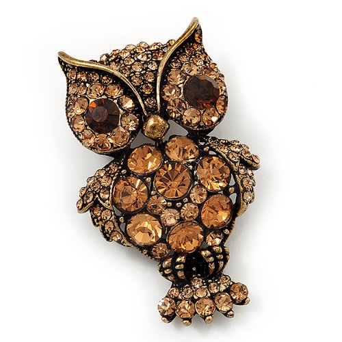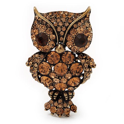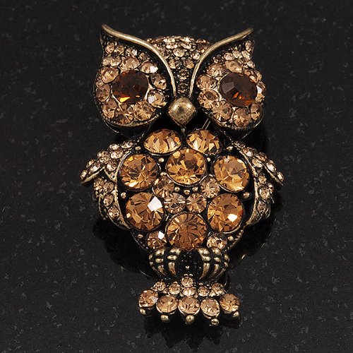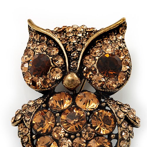 Owl-lovers rejoice! This adorable Antique Silver Amber Crystal Owl Brooch uses round-cut amber coloured crystals to fashion a whimsical, but stylish rendition of your favourite forest friend. Makes a great conversation piece and playful addition to any jewellery collection. It's crafted in antique gold metal and measures about 5cm x 3cm. Fastens with a flag pin and revolver clasp.Feature