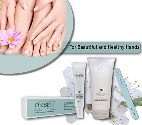 Concerned about the way your nails look and feel? Tired of using unnatural chemicals? ONSEN presents a special, easy way to care for your nails, including our super magic Nail Buffer, Nail File, a one of a kind Cuticle Cream Conditioner and our own best time seller Hand & Body Lotion. ONSEN's Nail Care Collection was designed for professional nail care; smooth and perfect polish for natural healthy-looking, shiny nails. Get ready to be amazed.