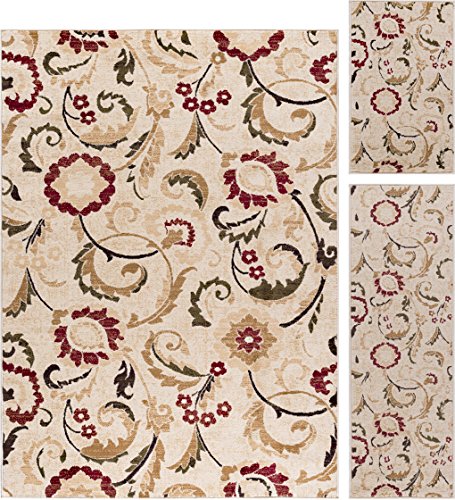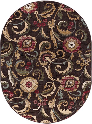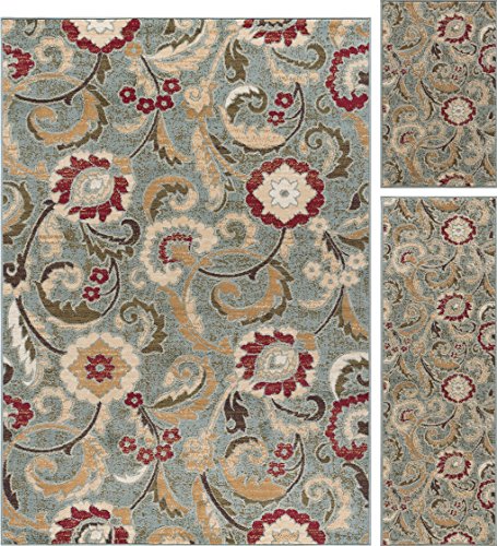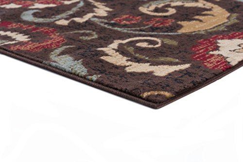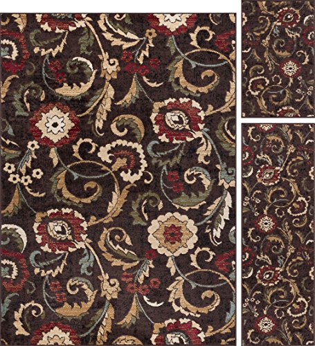 This traditional brocade design has been updated with a contemporary rhythm. The favorable blend of hues creates a transitional area rug that will transcend rigid design constraints. Brown background with gold, beige, blue, green, ivory and red. Available in several individual sizes and as a three piece set so you can harmonize your theme throughout your home. It is easy to care for, vacuum regularly to maintain its appearance. Spot clean as needed with mild detergent, do not dry clean or bleach.Feature