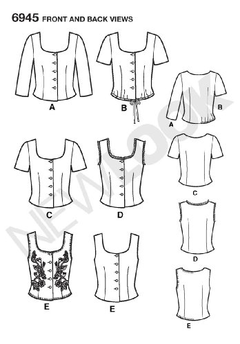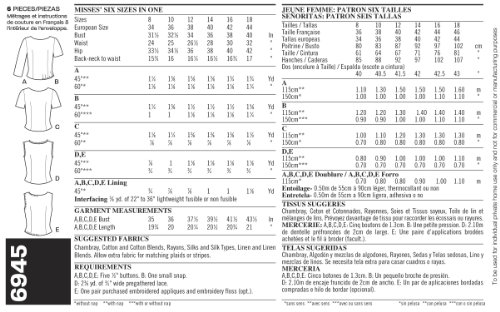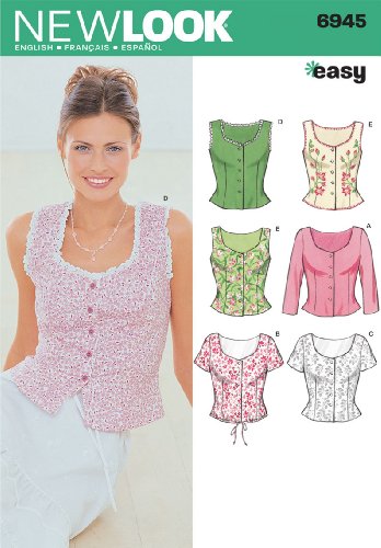 -. Feature : Misses Tops in size A (8-10-12-14-16-18), New Look Pattern #6945 / Number of looks included: 5 / Designed in UK, Manufactured in USA / Instructions are written in English, Spanish, and French / Sested fabrics: Chambray, Cotton and Cotton Blends, Rayons, Silks and Silk Types, Linen and Linen Blends; allow extra fabric for matching plaids or stripes