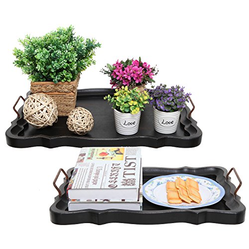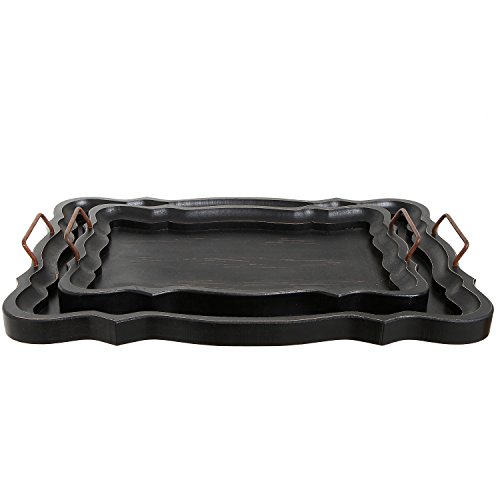 Set of 2 Rustic Black Brown European Vintage Style Wood Serving Trays / Platters with Metal Handles