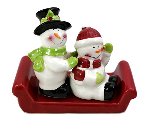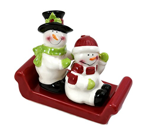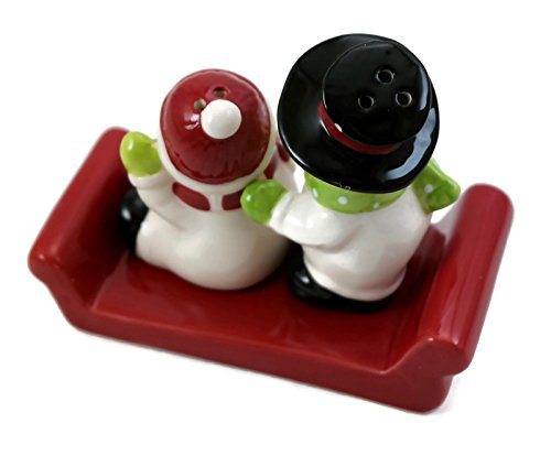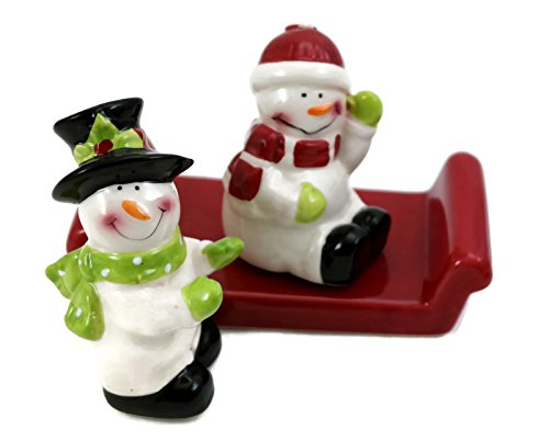 Holiday Snowmen on Red Sleigh Salt and Pepper Set, Ceramic 3 pc Set