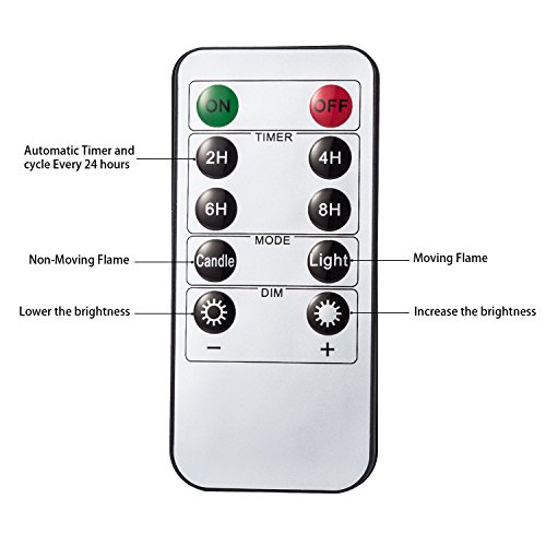 - 10-KEY REMOTE CONTROL AND TIMER: With one remote control, you could control all our candles. Once the timer is set, the candle comes on at the same time each day and stays on for either 2 hours/4 hours/6 hours/8 hours. For example, set 2H at 20:00, it will automatically shutdown at 22:00. Will be automatically open at 20:00 next day, at 22:00 then automatically shut down. It will cycle every 24 hours.