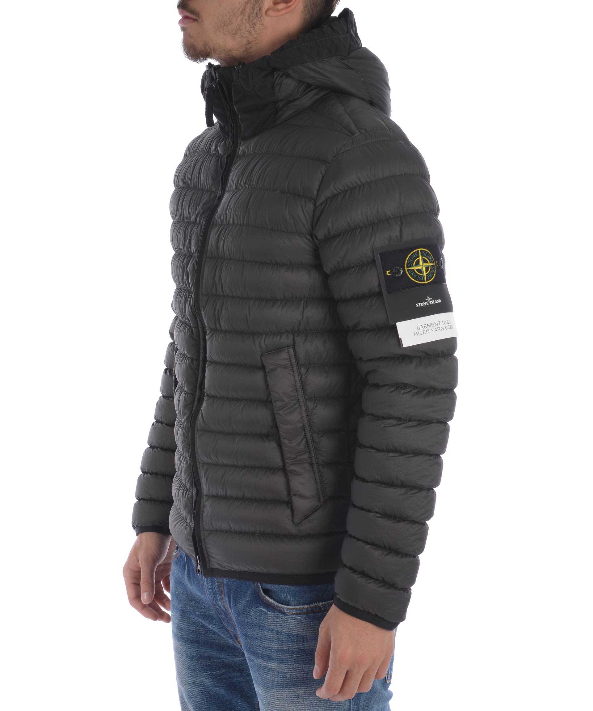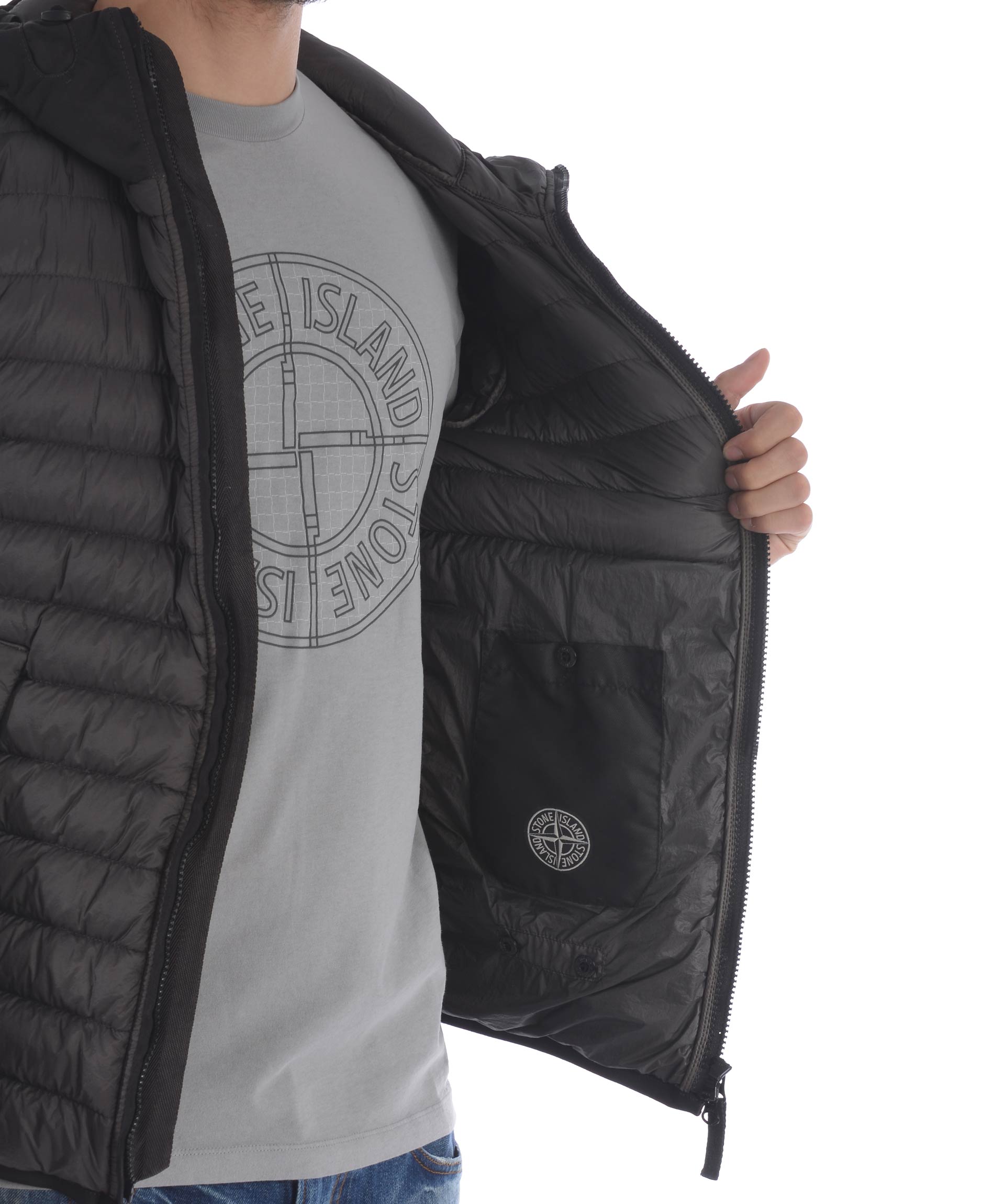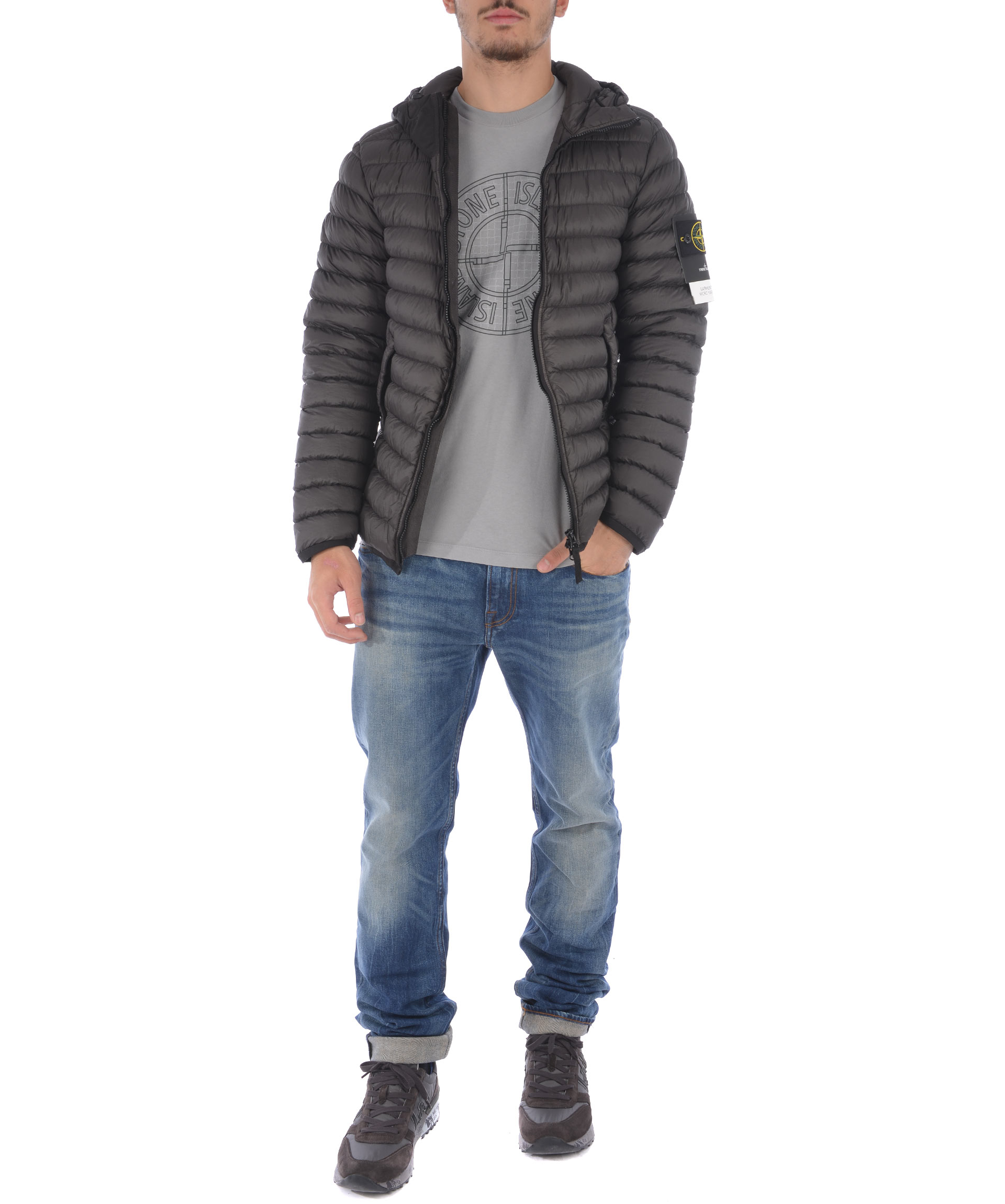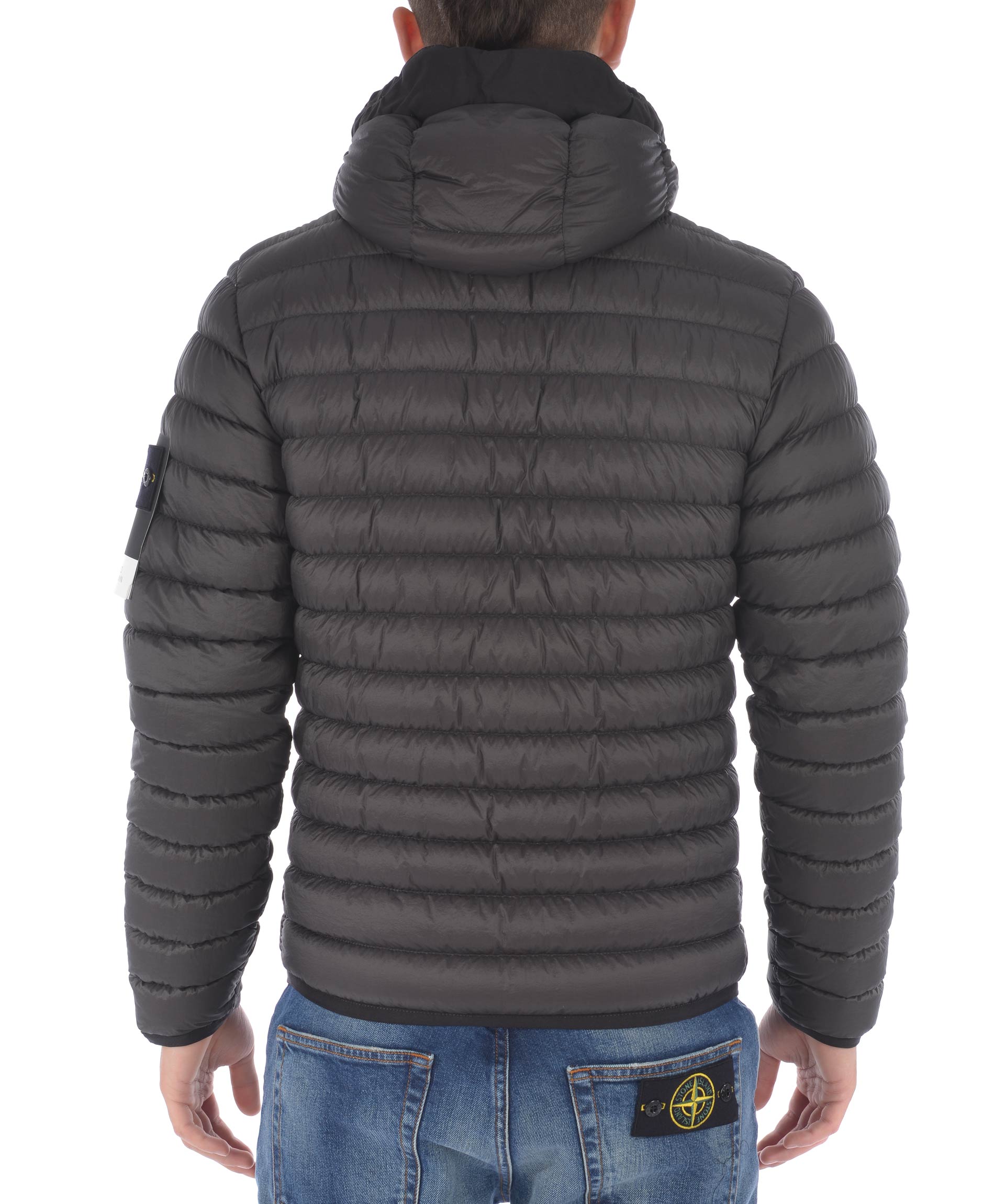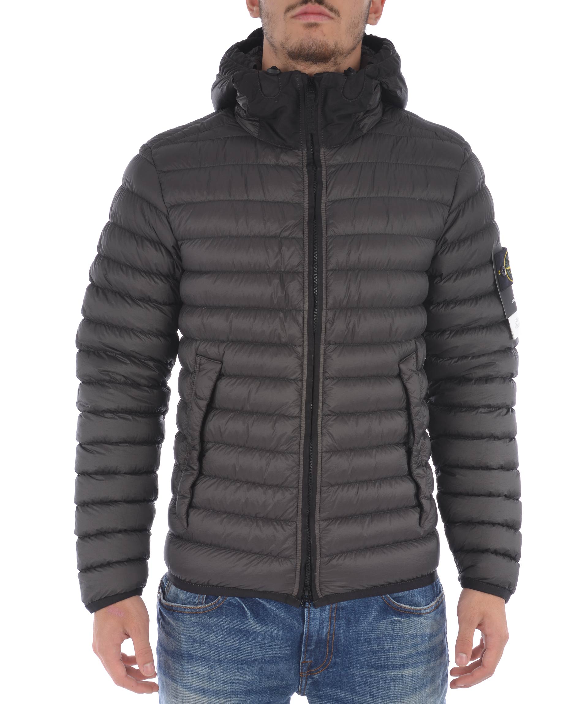 Piumino Stone Island in nylon trapuntato ultra leggero Grigio antracite. Imbottito con piuma d'anatra. Cappuccio con inserto in tela, visiera e coulisse. Chiusura frontale con zip. Tasche frontali con zip. Bordino elastico ai polsi e al fondo. Taschino interno con bottone. Patch logo in lana removibile sulla manica sinistra.