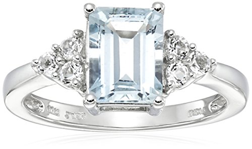 -. Feature : White gold ring featuring emerald-cut aquamarine stone bordered in small clusters of white topaz rounds / Imported
