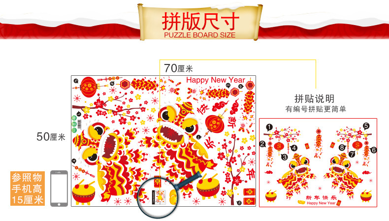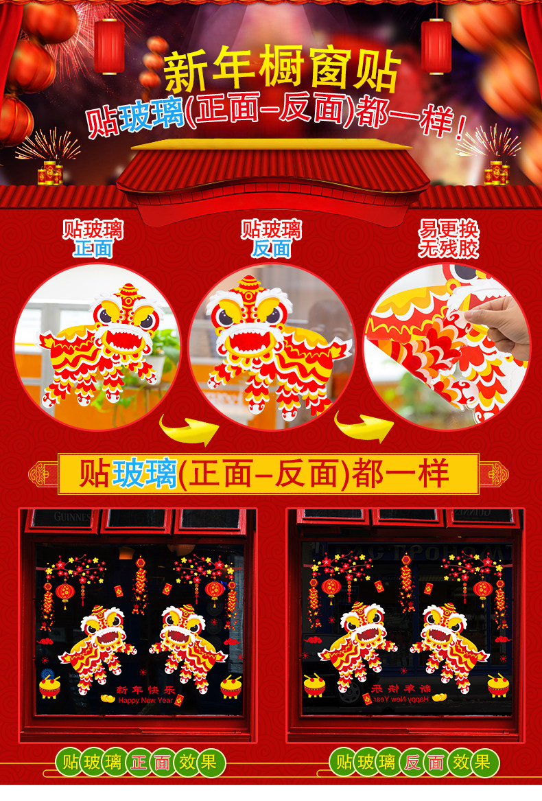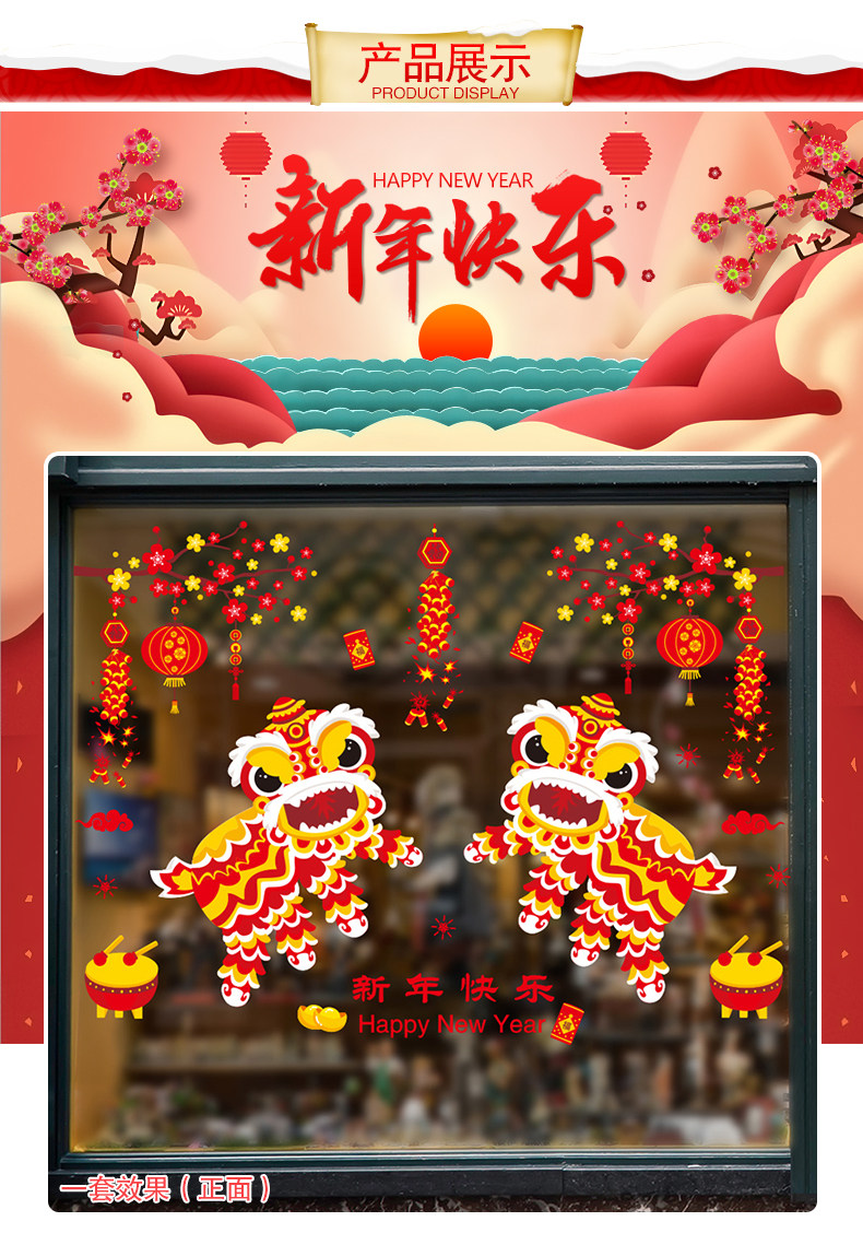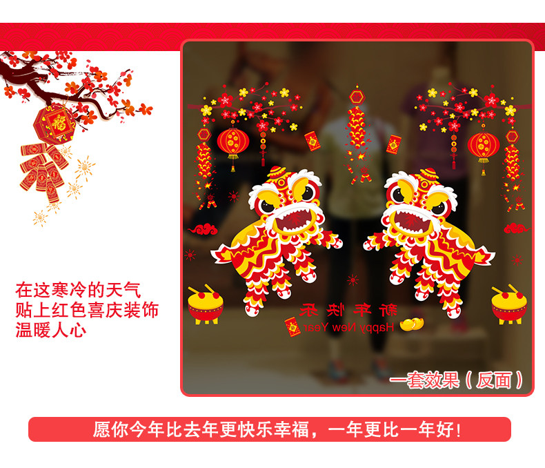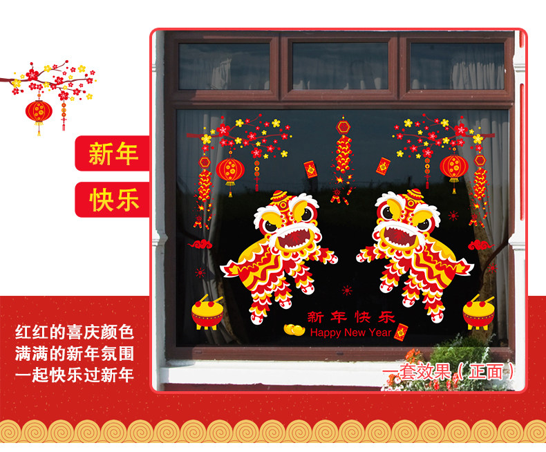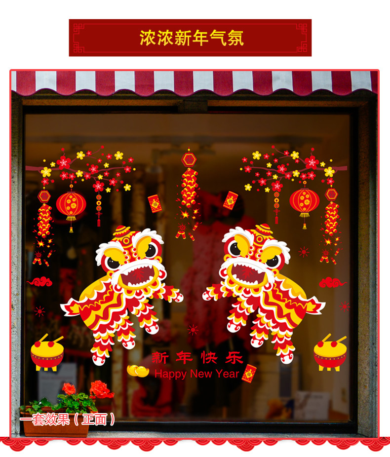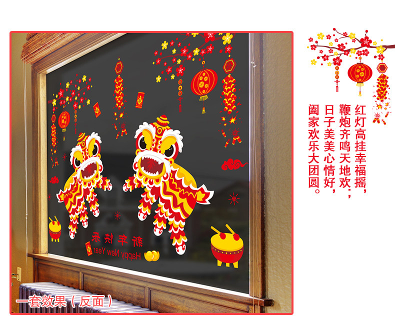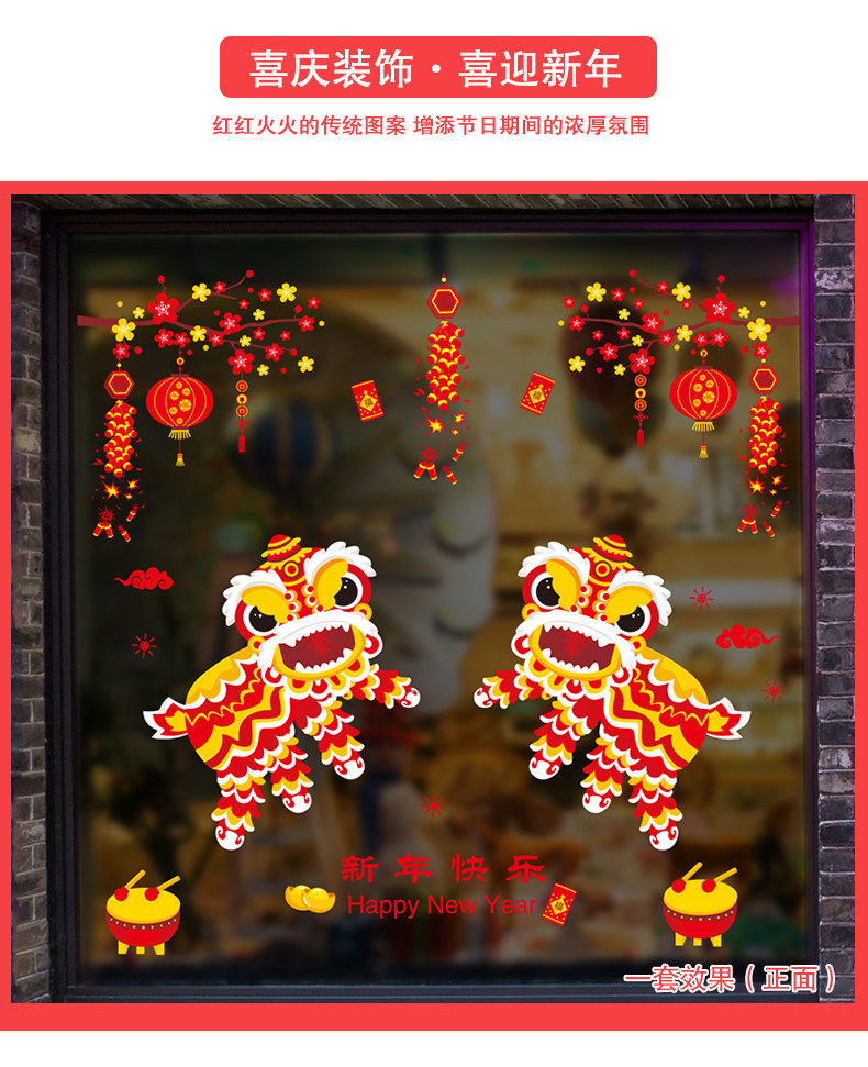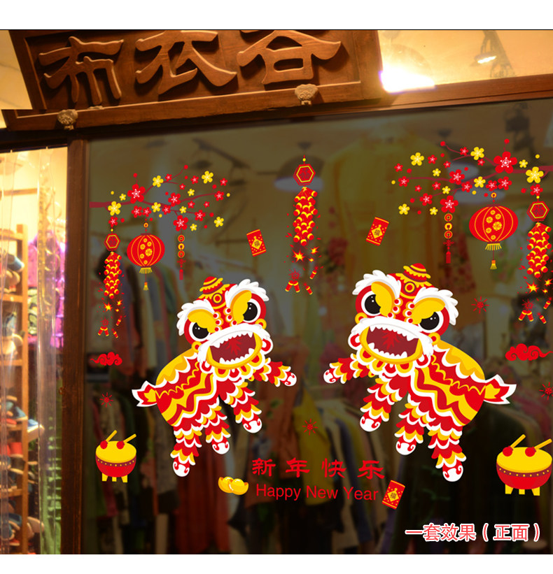 新年装快乐饰品玻璃橱窗贴纸墙贴画春节过年灯笼舞狮创意布置