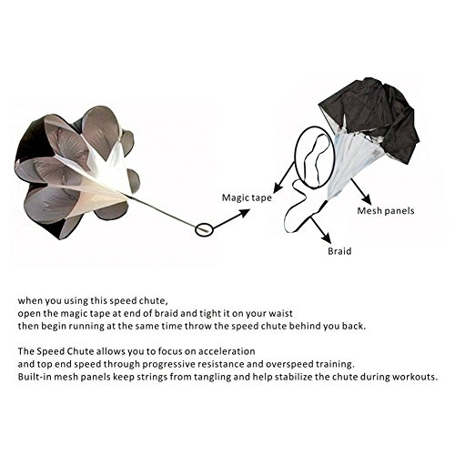 -. Feature : Speed Parachute Size: 56" diameter / Offers approximately 11-33 lbs of resistance / Speed Parachute is a ultimate training tool to improve sP.R.Int speed, lower body strength, acceleration and resistance / Opens as running begins, Adjustable waistband allows a comfortable fit to all players / Carry bag included
