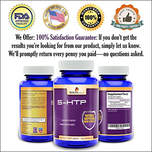 - Feature : Looking to control or suppress your appetite for weight loss? 5HTP is a building block for serotonin, aiding digestion / Aids positive attitude: Increases serotonin levels in the brain, works as a mood support and stress relief supplement / This pure extract is prepared in an FDA- & GMP-certified lab. You can feel confident about putting it in your body. / No Negative Side Effects: No more feeling cloudy, irritable or anxious the next morning, and it's gentle on the stomach / Money Back Guarantee: 100% satisfaction or your money back