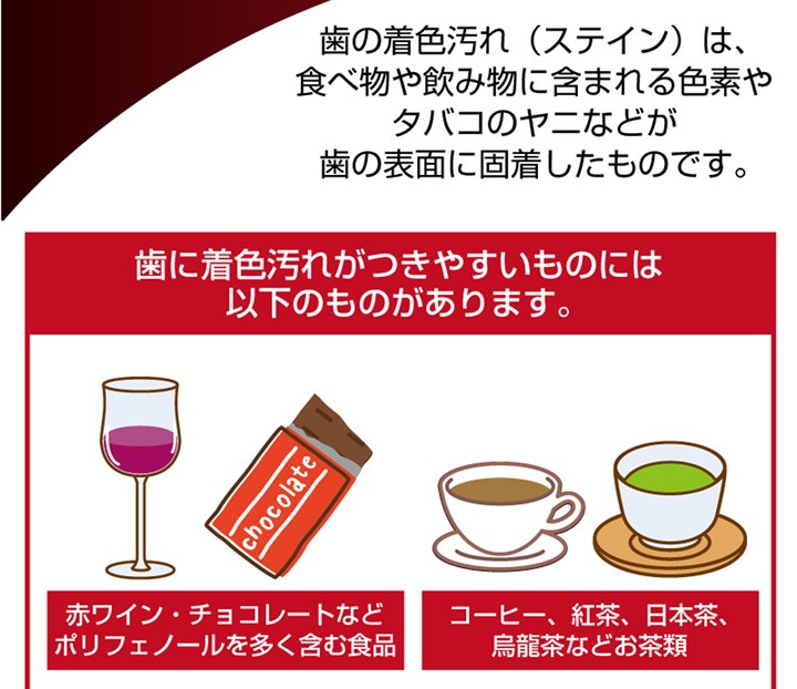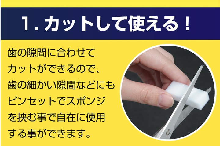 | 使用方法 | 1:付属のピンセットでスポンジをつまみ、水に濡らして軽く水気をきる 2:歯の表面をスポンジでやさしくこする。使用後はうがいをしてください →使用上のヒント 歯の部位に合わせてカットするのがオススメ! ※通常の歯磨き(ブラッシング)と併用してください ※スポンジは衛生上1回ごとに使いきりでご使用ください |