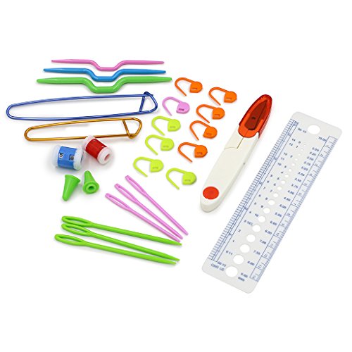 - It also includes a separate bonus pack which includes: 10 stitch markers, a stitch gauge, 2 row counter, a crochet scissors, 6 yarn needles and stitch holder (the safety pin like item). 3 double-ended bent plastic stitch holders in large, medium and small, two metal stitch holders (safety pin items ) in two different sizes.