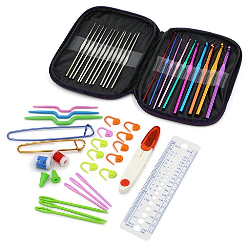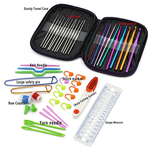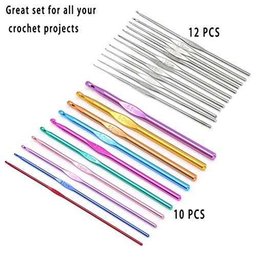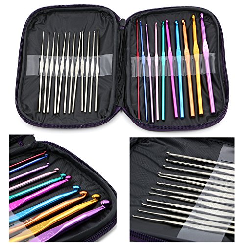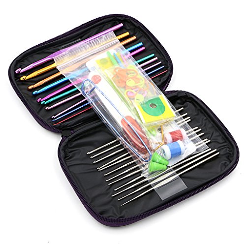 - This crochet kit includes the following items inside a purple vinyl zip case: 22 Crochet Hooks in all: -10 Colorful aluminum crochet hooks: 2.0, 2.5, 3.0, 3.5, 4.0, 4.5, 5.0, 5.5, 6.0, 6.5mm sizes - 12 silver steel crochet hooks: 0.60, 0.75,0.85, 0.90, 1.00, 1.10, 1.25, 1.40, 1.50, 1.60, 1.75, 1.90mm sizes.