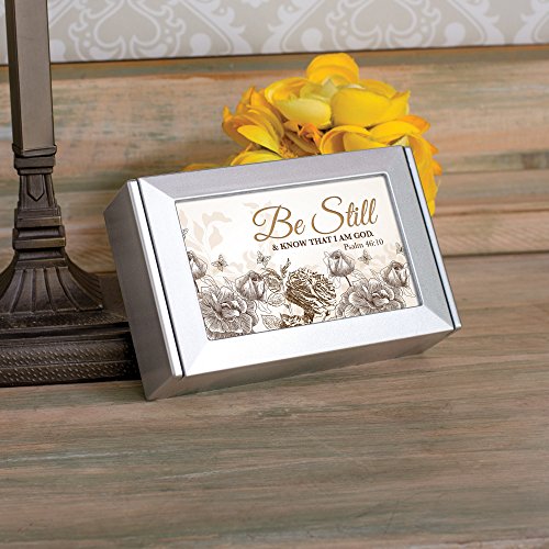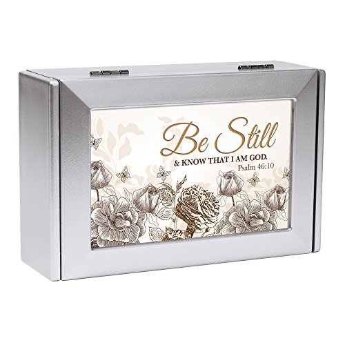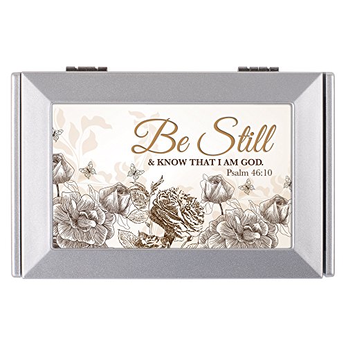 Be Still and Know That I Am God Black White Floral Silvertone Petite Keepsake Jewelry Box