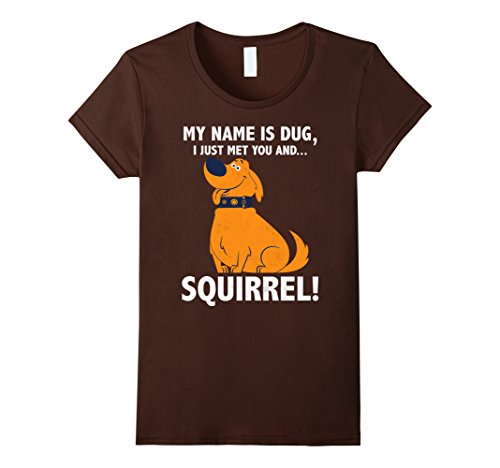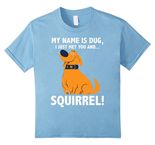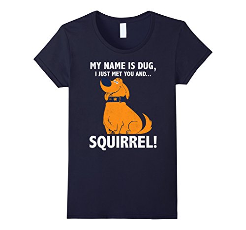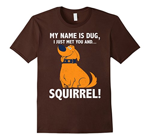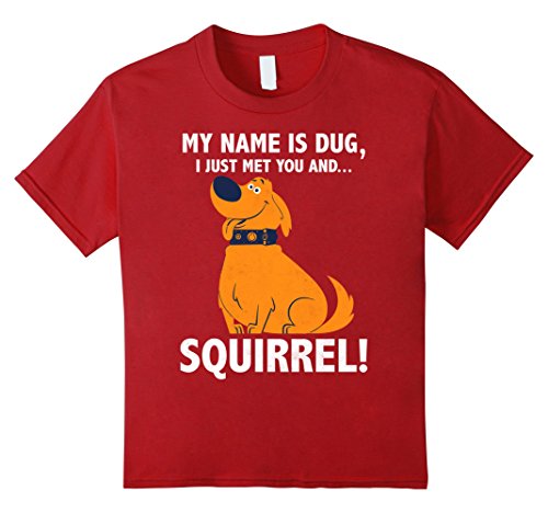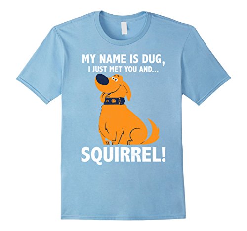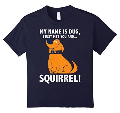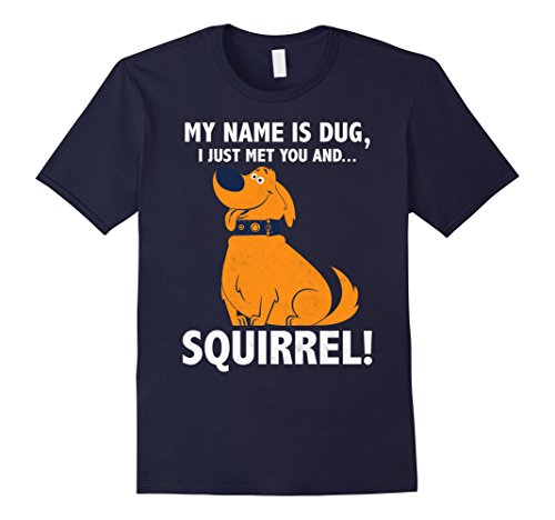 You are Dug's master and he loves you and the Up My Name is Dug Squirrel Graphic T-Shirt with all of his heart! The adorable dog, Dug, is portrayed alongside Dug's infamous saying "My Name Is Dug, I Just Met You And.. SQUIRREL!" in a distressed print down the front of this hilarious Up shirt.Feature