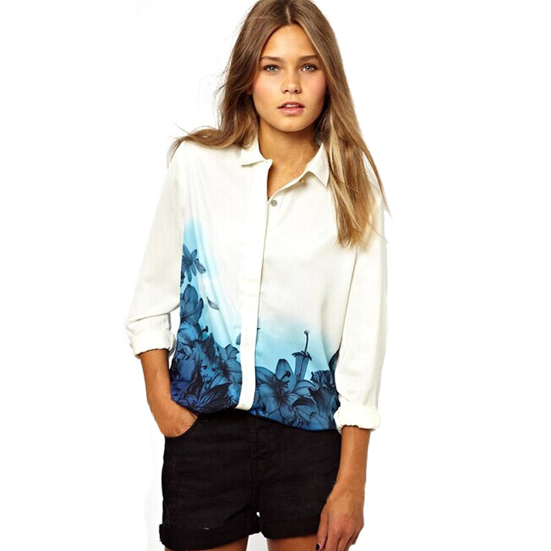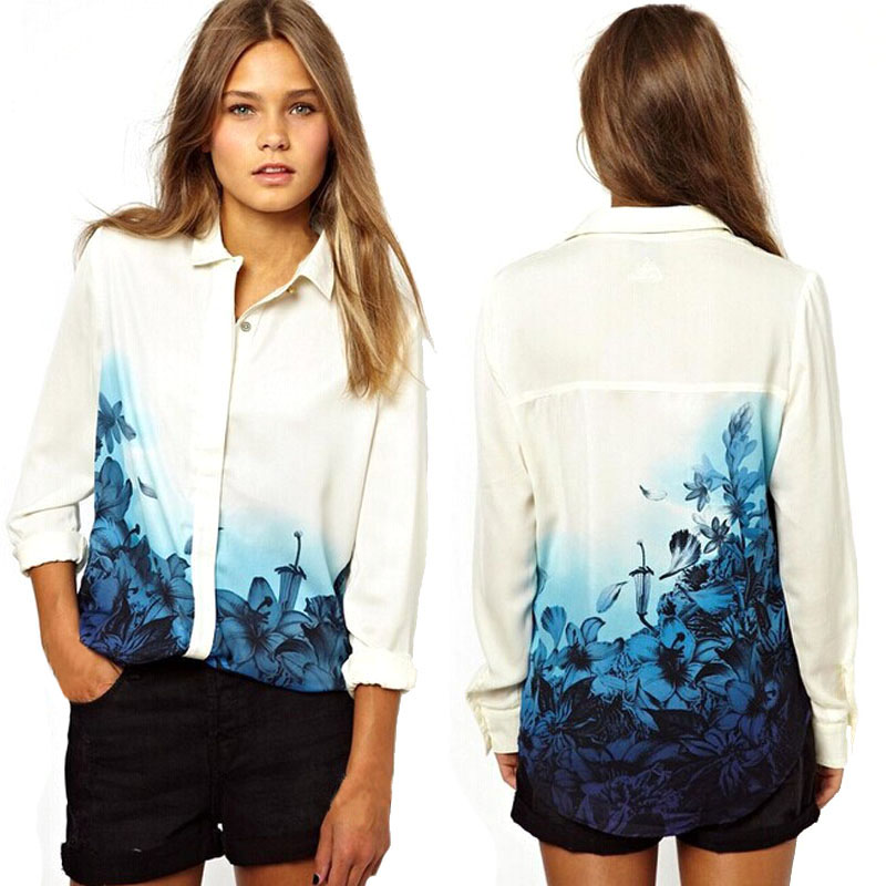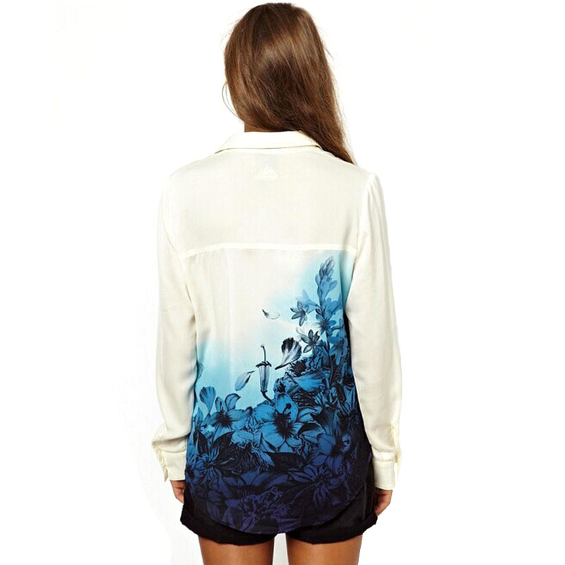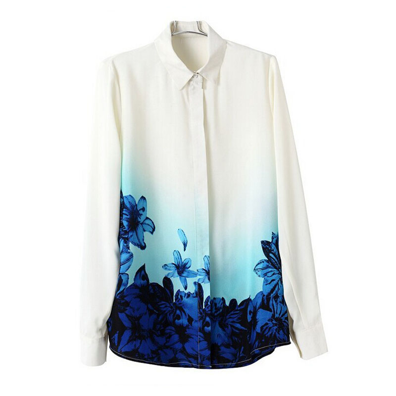 Korean Version Women\'s Vintage Chiffon Blouse Gradient Blue Flower Printed Shirt Full Sleeve Turn Down Collar Blouse