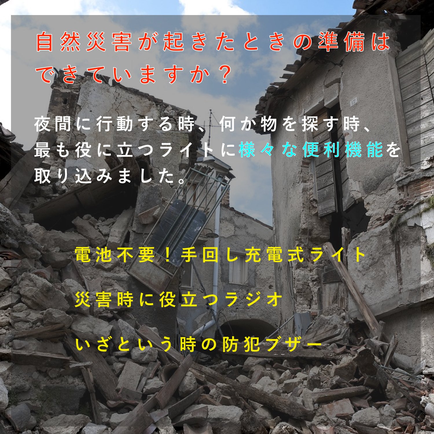 It is useful in case of daily use, crime prevention, disaster prevention, earthquake countermeasure, camping, power outage etc. by using three, high brightness LED elements.