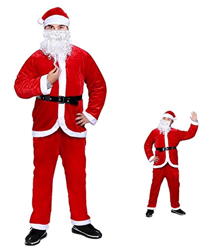 -. Feature : 🎄 🎄[PLEASE NOTE ONE SIZE FIT MORE]: VeMee Santa Claus Costumes One Size fit M-XL. The Red Costumes includes 5 pieces: Pullover Coat, Pants with pocket, Black Buckle, White Beard, a Hat with Plush Pom Pom. The Burgundy includes 6 pieces: Pullover Coat, Pants with pocket, Black Buckle, White Beard, a Hat, boot. / 🎄 🎄[HIGH QUALITY&HEALTHY]: Deluxe Christmas Santa Suit is made of high quality material. breathable, warm and comfortable, skin-friendly, be healthy for your body. The Overalls Santa Suit is a top-of-the-line suit that includes pullover coat, matching pants with pocket, Hat, buckle, white beard. This suit is a great choice for Santa's who want the ability to take off the coat and still look like Santa while remaining cool / 🎄 🎄[WHAT YOU WANT]:Complete deluxe Santa Claus costumes with exquisite plush and it trimmed with luxurious white longhair plush and completely lined. you can make a visit from Santa an annual tradition, packaged in a reusable storage bag. High quality Santa suit you'll enjoy wearing for years to come It will be a funny accessory and will pay anyones attention! / 🎄 🎄[ESSENTIAL for YOUR PARTY]: Christmas Holiday is approaching, Get ready for thhe party with cute Deluxe Santa Suit ? Wear it to celebrate Christmas holiday, adds Christmas atmosphere, catch the eyes and gets you in the mood for Christmas. Special design for Christmas Party. / 🎄 🎄[100% MONEY-BACK WARRANTY]: Your satisfaction is our biggest concern. If you find any problem about the product, we will spare no efforts to deal with it and promise to provide 100% replacement or refund. Thank you
