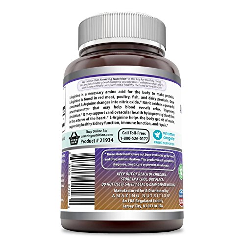 Amazing Formulas L-Arginine dietary supplement contains L-Arginine HCL or hydrochloride, which has been studied extensively and is known to be absorbed and utilize better by the body. It supports cardiovascular health and immune system function.