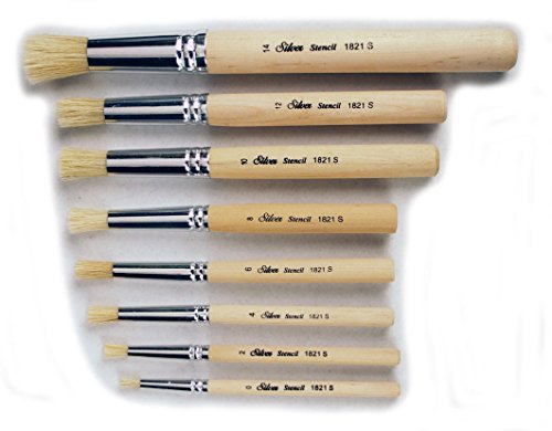 Professional quality stencil brush set. Each brush made of square cut medium-length natural white hog bristle. Bristle is fitted to polished seamless aluminum ferrules, mounted to comfortable shaped natural short wood handles.Feature