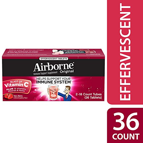 ReleaseDate : 2016-12-19 Studio : Airborne Publisher : Airborne Binding : Kitchen Product Description Airborne Effervescent Tablets provide real immune support in a great-tasting and fast absorbing formula. Each serving (1 tablet) delivers a blast of 1000 mg of Vitamin C plus 13 other immune system supporting vitamins, minerals, and herbs, including Echinacea, ginger, and other herbal extracts from whole plant materials.* Adults and Children over 12 years old, simply drop 1 tablet in a glass of water or favorite beverage, let dissolve (about 1 minute) and drink. Can repeat every 3-4 hours as necessary. Take up to 3X per day as needed. Gluten Free and No Preservatives. *These Statements have not been evaluated by the Food and Drug Administration. This product is not intended to diagnose, treat, cure or prevent any disease. 0