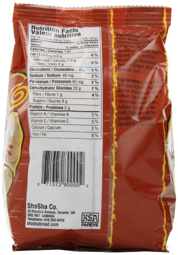 -. Binding : Grocery -. Brand : ShaSha Co. -. EAN : 0671372800002 -. Feature : They are all natural made with no preservatives additives or trans-fat; They are low in sugar fat and a good source of fiber; They contain a blend of the finest quality spices chosen for their flavor and health benefits; They are nut and dairy free -. IsAdultProduct : 0 -. Label : ShaSha -. LegalDisclaimer : This P.R.Ice is for one bag -. Manufacturer : ShaSha -. NumberOfItems : 1 -. PackageQuantity : 1 -. ProductGroup : Grocery -. ProductTypeName : GROCERY -. PublicationDate : 2013-07-14 -. Publisher : ShaSha -. ReleaseDate : 2013-07-14 -. Size : 10.5 Ounce -. Studio : ShaSha -. Title : ShaSha Original Ginger Snap Cookies, 10.5oz (300g) -. UPC : 671372800002