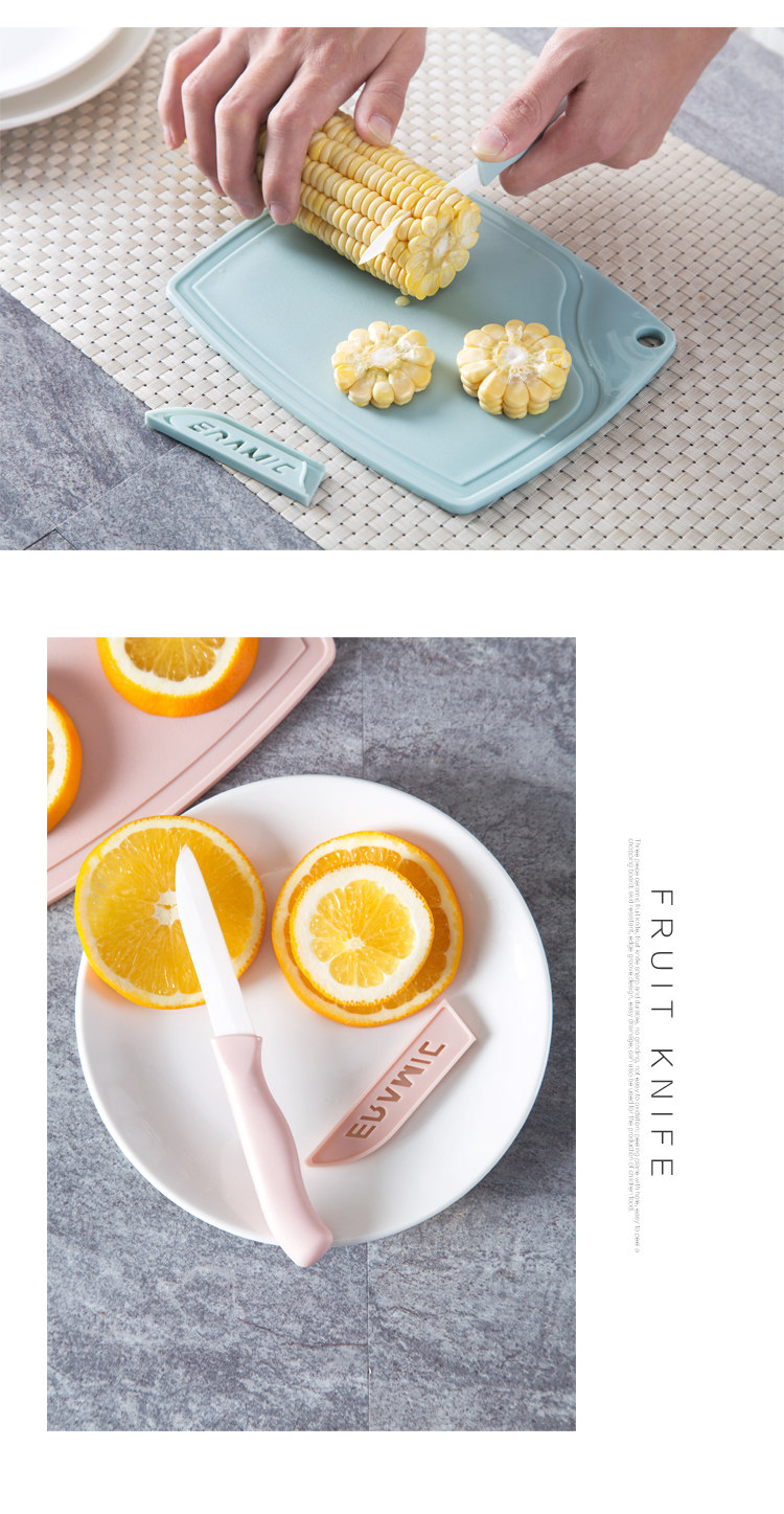 Summary: Ceramic fruit knife three-piece, sharp and durable fruit knife, no grinding, not easy to oxidize; Peeling dig hole, easy to peel the bud eye; cutting board non-slip wear, edge groove design easy to drain; can also be used for making Children food supplement.