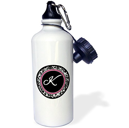 3dRose wb_154603_1 "Letter K stylish monogrammed circle-girly personal initial personalized black damask with hot pink" Sports Water Bottle, 21 oz, White