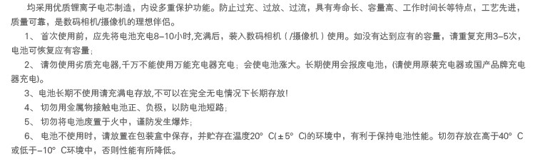 新电池首次使用,先将电池出厂时自带的虚电用完,锂电池的前3-5次充电时间最好为6-8小时。注意不要过充,以免损坏锂离子电芯,影响使用寿命。循环充放电3-5次后电芯被充分激活,待机进入最佳状态。以后每次充满即可。