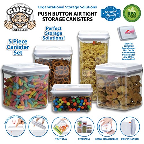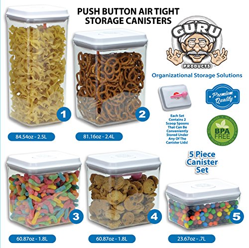 5 pc. Pop Up Set Clear Food Containers w Airtight Lids for Kitchen and Pantry Storages - Storage for Cereal, Flour, Cooking - BPA-Free Plastic Guru Products