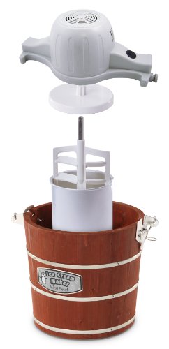 Makes fresh ice cream in about 40 mins, nostalgia look of an old fashioned wooden ice cream maker, aluminum canister for faster cooling, electric motor with food safe dasher, 50-watts