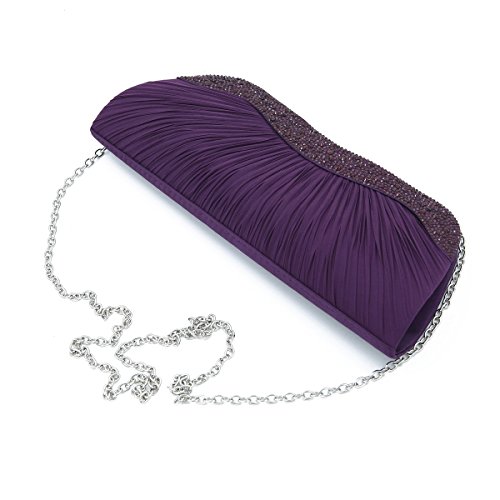 This premium quality evening clutch is both elegant and stylish. Pleated satin fabric front with sparkling crystal top. fully lined with magnetic top closure and inner wall pocket. Removable hideaway shoulder chain strap with 23" drop. Stunning, functional and versatile. The size is 10.5" (L) x 4" (H) x 1.25" (W). Elegant design and luxury feel. A must have accessory for the perfect night out.Feature