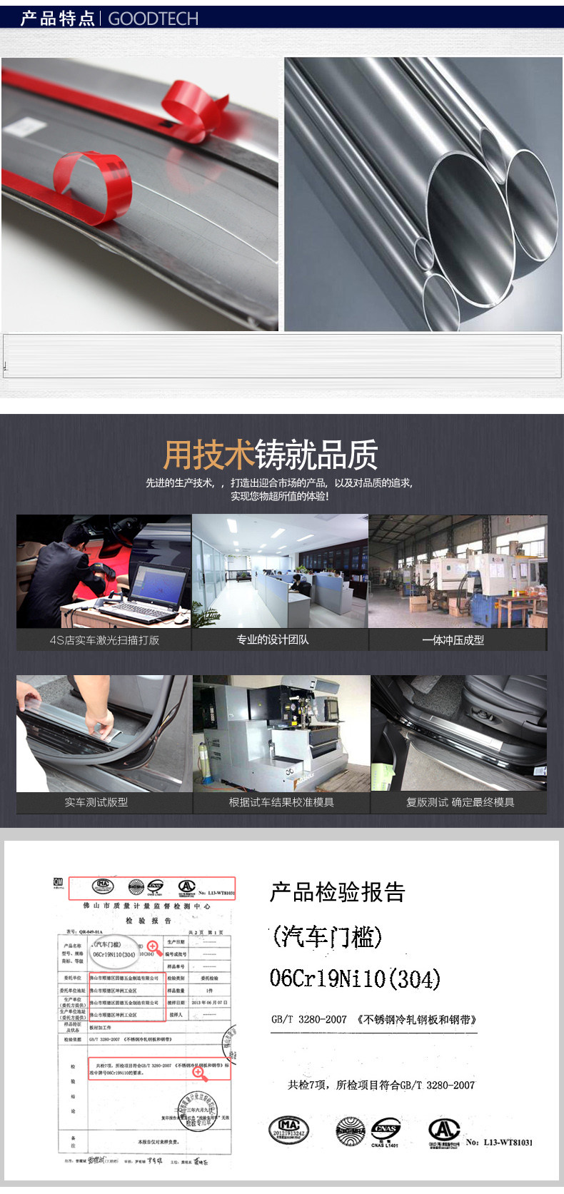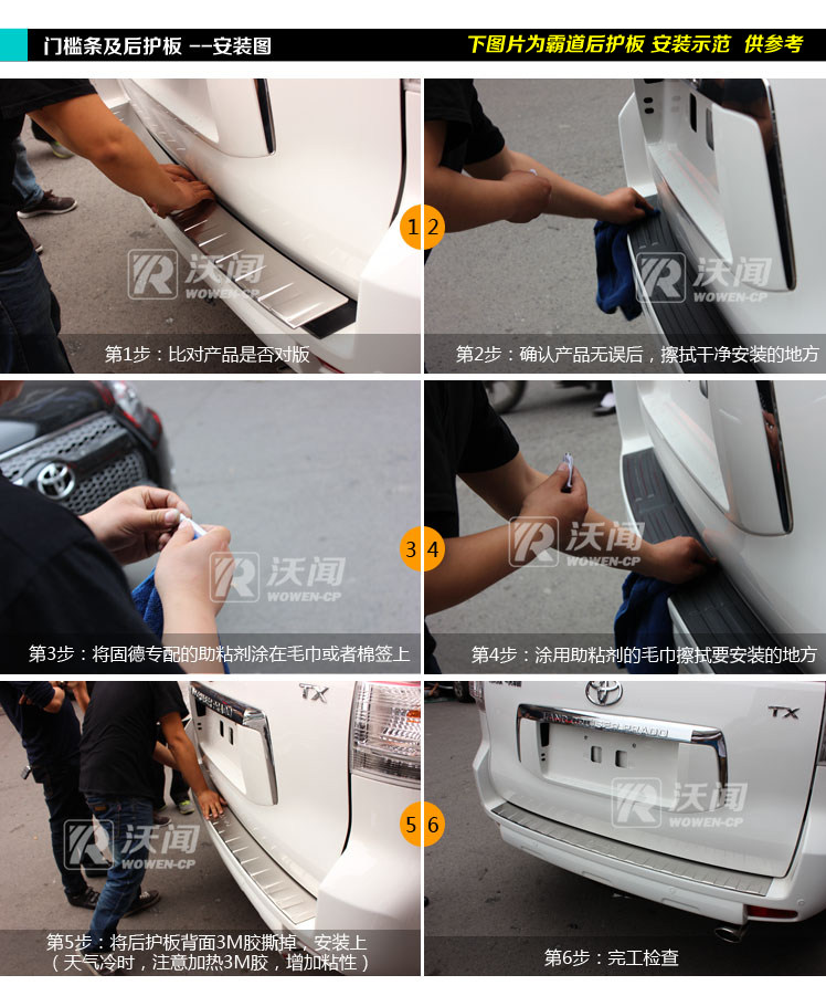 第3步用吹风机烤枪加热背面的双面胶之后贴在门槛处,对准在贴,贴好后用手用力压压,如果用劲不够大的 ,可以脚踩上去 ,使其更加牢固 ,3天内不要洗车
