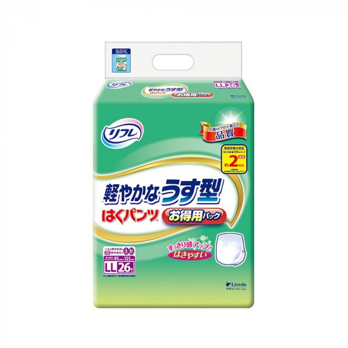ウエスト部分が軽い力でぐーんと伸びて、上げ下げカンタン!うす型吸収体と股下すっきりカットで、ゴワゴワせず動きやすいうす型パンツです。