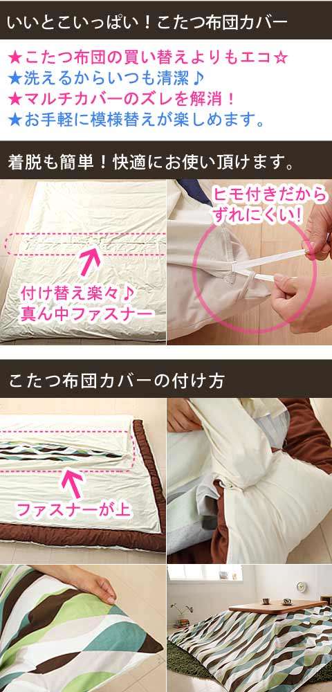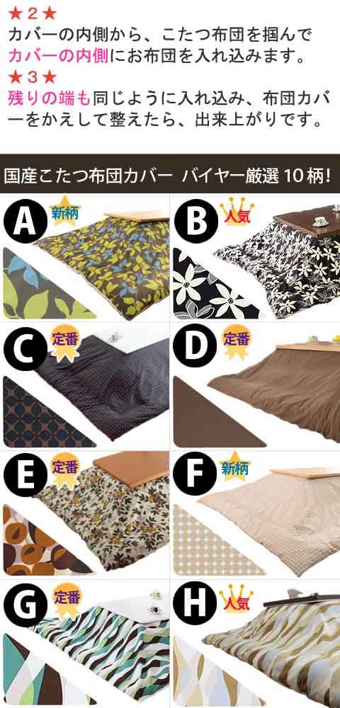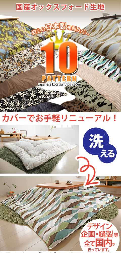 ●商品について:しわがつきにくく丈夫なオックス生地を使用した日本製のこたつ布団カバー。10パターンのカバーをご用意してますので、お好みを選んで模様替えのアイテムに、こたつ布団のリフレッシュにどうぞ♪ファスナーはカバーの中央についており着脱しやすくなっています。洗濯機丸洗いOKでいつでも清潔にお使いいただけます。四隅に布団とカバーのズレ防止用の留め紐付きです。