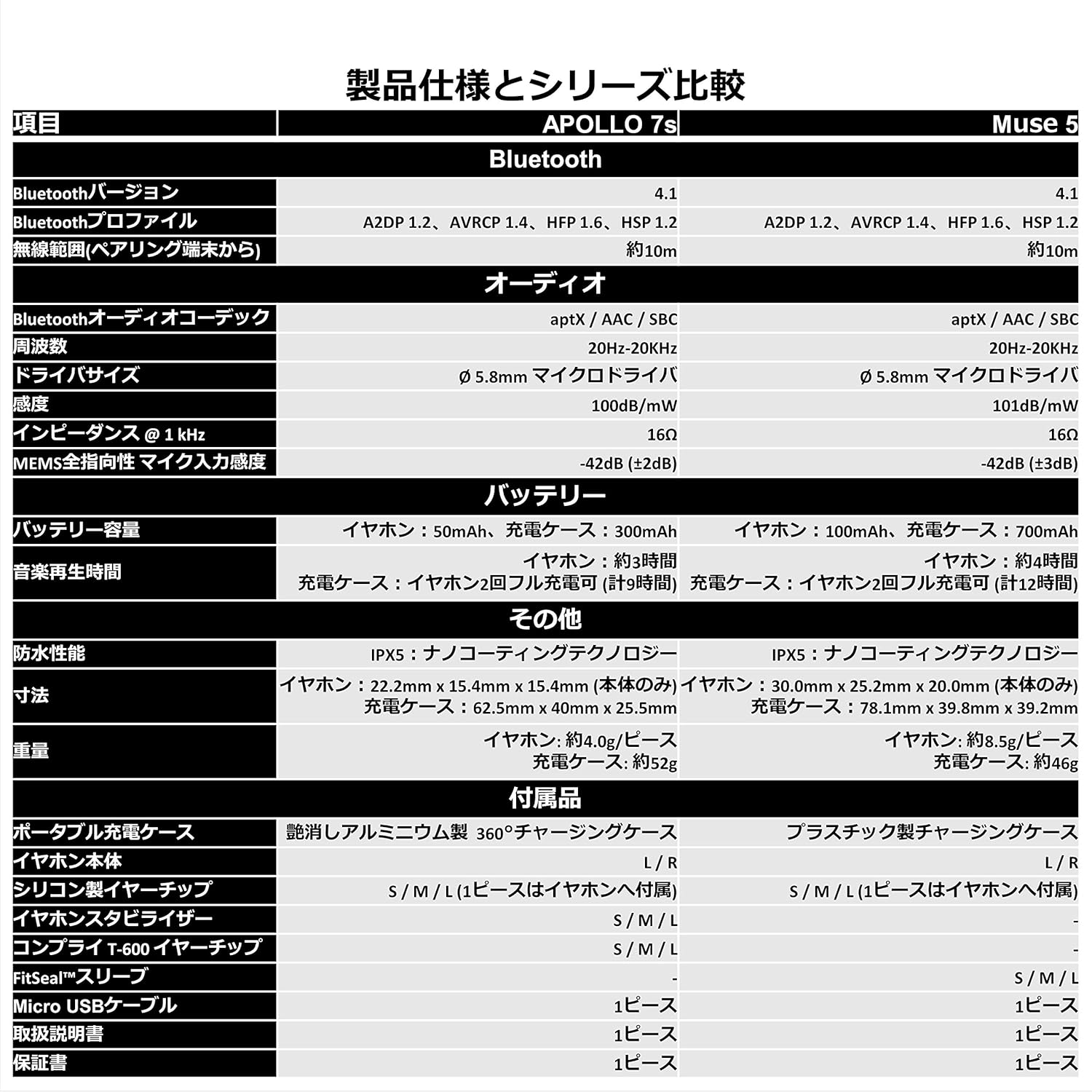 モデル名: MUSE 5 Bluetoothオーディオコーデック: aptX / AAC / SBC Bluetoothプロファイル: A2DP 1.2、AVRCP 1.4、HFP 1.6、HSP 1.2 IPX5防水対応 ERATOSURROUND テクノロジー採用 ハンズフリー通話対応 音量調整/再生/一時停止/曲送り/曲戻し対応 音楽再生時間: イヤホン: 約4時間/充電ケース: イヤホン2回フル充電可 (計12時間) 本体サイズ: 約 幅 2.5 x 奥行 2.0x 高さ 3.2 cm (イヤーチップ含む) 質量: 約 8.5g