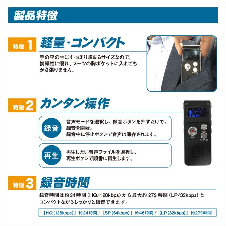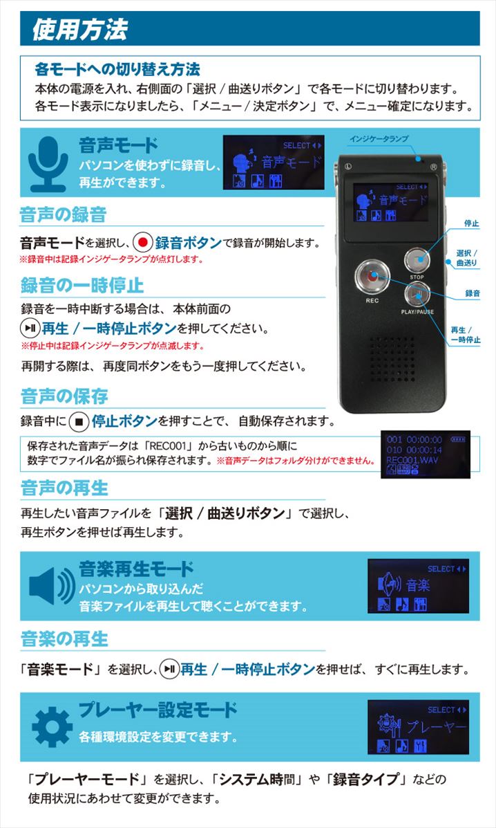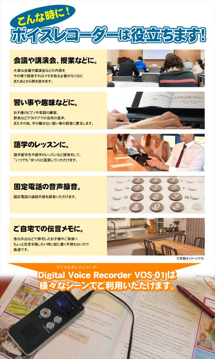 ●お子様のピアノや楽器の練習、野鳥などアウトドアでの自然の音声、また、その他、手の離せない習い事の録音に重宝します。
