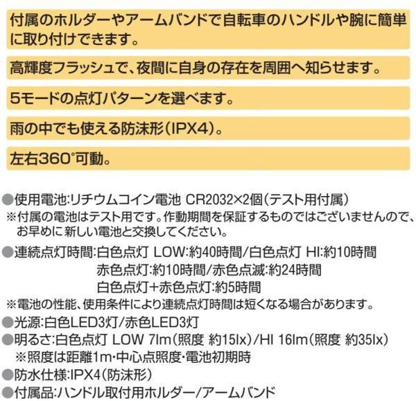 付属のホルダーやアームバンドで自転車のハンドルや腕に取り付けて使用できるライトです。 |