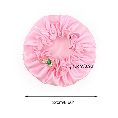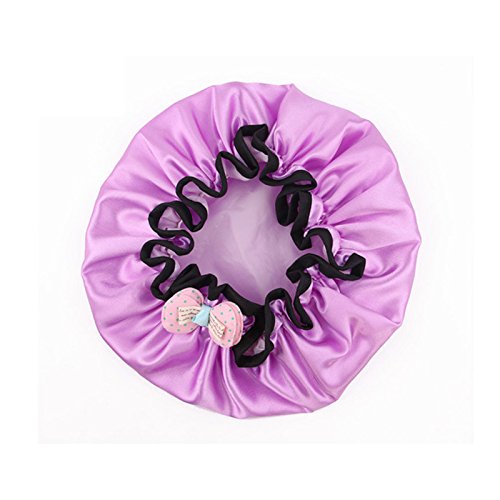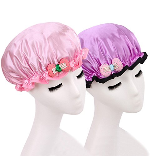 2pcs Shower Cap, Pink x 1, Light Purple x 1. Using double-layer material sewing, beautiful appearance fashion, EVA waterproof effect is good, satin cloth silky smooth, durable.