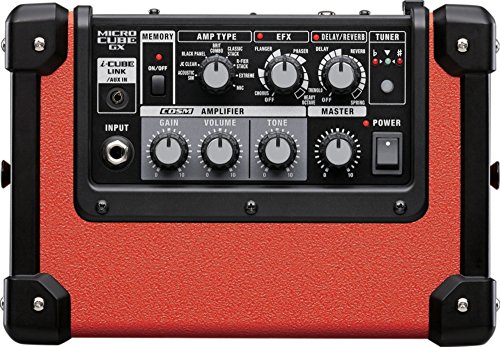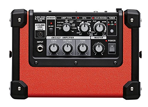 Studio : Roland Publisher : Roland Binding : Electronics Product Description Micro Cube GX 3W 1x5 Battery Powered Guitar Combo Amp Red. The Roland 3W 1x5" MICRO CUBE GX combo amp gives you the same tone and versatility that you've come to know and love in the CUBE Series, and puts it in a battery-powered package that you can take anywhere.It features recording/Headphones output and stereo Aux input for MP3/CD players, etc. The MICRO CUBE GX can be powered on batteries (LR6 (AA) type x 6) or a supplied AC adapter. It also includes a carrying strap. Rock for Hours on Batteries The MICRO CUBE GX features the same ultra-compact footprint, battery-powered operation, and big tone that made the original MICRO CUBE such a massive hit around the globe. With up to 25 hours of playing time using six NiMH AA-size batteries, you can enjoy uninterrupted fun while jamming at home, at the beach, on camping trips, at parties-wherever! Increased power output delivers even better performance than before, and a chromatic tuner is built in, eliminating the need to carry an external tuner when you play. 8 Classic and Modern Amp Models Filled with Roland's renowned COSM amps, the MICRO CUBE GX provides tones for playing any musical style, from ultra-clean jazz to heavy rock and everything in between. The newly added Extreme amp kicks things up a notch, giving you a massive voice for crushing, in-your-face metal riffs. There's also a MIC setting for using the amp with a vocal microphone. Five different EFX types are available to sweeten your sound, with a new Heavy Octave effect that works great for adding unique, ultra-low power to distorted tones. An independent Delay/Reverb processor is onboard as well, with a newly added spring reverb option for authentic surf and roots-rock sounds. High-Quality Effects There's no need to lug around pedals when the MICRO CUBE GX comes with eight DSP effects. All the essentials are included-from chorus and flanging to a phaser and tremolo effect. A separate Delay/Reverb processor lets you dial in anything from slapback and lo... 0