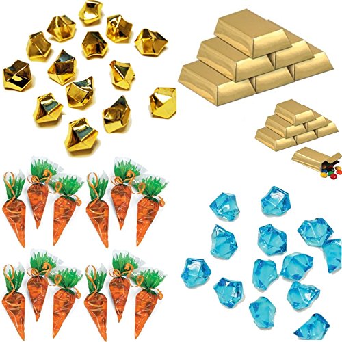 - Feature : Celebrate your child's birthday bash with this unique Miner-themed birthday party pack for 12 Guests. / Complete table setting for twelve guests include: (1) stone block wall tablecover (plastic 54"x104"), (14) Lime-green block luncheon plates, (12) Green dessert plates, (12) 9oz. plastic shiny gold cups, (16) Miner printed luncheon napkins. / (1) 3D Treasure Chest cardboard centerpiece (12"x8"x6"). Fill with party snacks, goodies or favors. (15) Carrot shaped cello favor bags with ties. (Mining game trivia: Carrots are used to breed chickens and pigs and when used on pigs, will activate their love-mode. Impress your child with this fun gaming fact.) / (12) Mini gold foil bricks to hold candy or jewels (3" long), (12) Blue acrylic diamonds, (12) Shiny Gold nuggets (acrylic gems are approx. 1"x ½ "), (10) Kelly green latex balloons, (10) Black latex balloons. All Balloons are helium quality and inflate to 12". Balloons ship uninflated. / (12) DIY black chalkboard eggs that can be colored with chalk or painted to resemble Spawn Eggs (chalk included in pack). Once colored, put the eggs in a bowl and play a fun charades game by having the party guests secretly draw an egg from the bowl and then act out the animal or creature that spawns from it. Have the best Miner Party of the year without all the work!